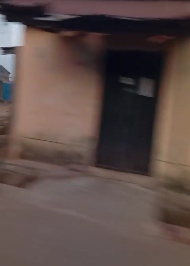 blurry scene of a rural area, likely in Africa. The camera is moving, possibly from a car or motorcycle. The landscape is mostly dry and dusty, with sparse vegetation. There are simple, one-story buildings, some made of brick, with corrugated metal roofs. The road appears to be unpaved or poorly paved. There is a motorcycle parked outside one of the buildings. The sky is overcast.