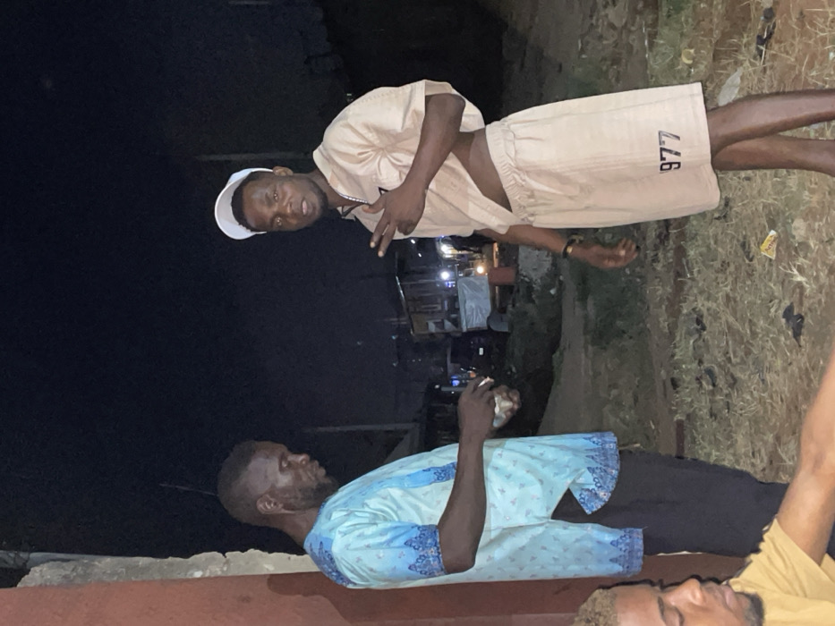 Two men are visible outdoors at night. The man at the top wears a tan suit, white cap, and displays a peace sign. Below him, another man in a light blue patterned shirt and black pants is seen smoking. A portion of a third man, wearing a yellow shirt, appears at the bottom right. The background features dark surroundings, possibly a street or yard.