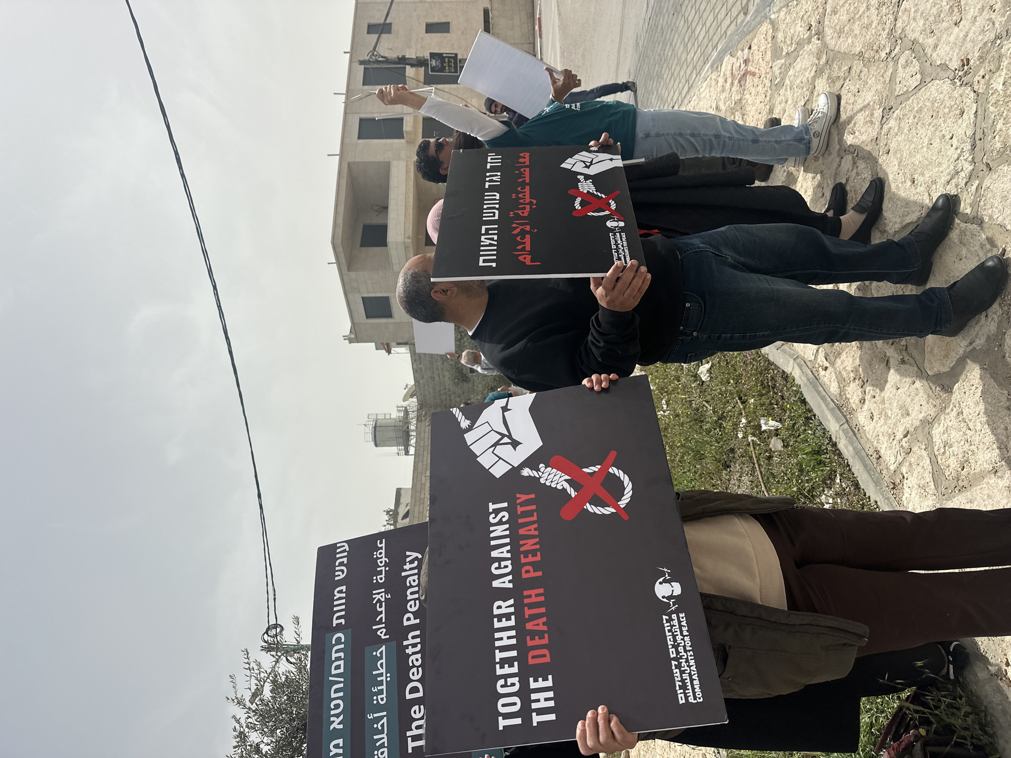 People are protesting against the death penalty. They are holding signs that say "Together Against the Death Penalty" in English and Arabic, as well as signs that say "The Death Penalty" in English and Hebrew. The signs also depict a clenched fist and a rope tied in a noose with a red cross through it. The signs also say "Combatants for Peace" in English, Hebrew, and Arabic. The protest appears to be taking place in a city. The city may be Doha, Qatar based on what is stated in the prompt. There is a building in the background. The street is paved with cobblestones.