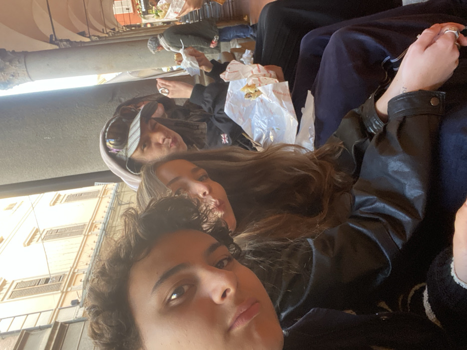 A selfie-style photograph depicts a group of young individuals seated under a historic stone portico, characteristic of the city center of Bologna, Italy. In the immediate foreground, to the left, is a young person with dark, curly hair and brown eyes, looking directly at the camera. Next to them, a young female with long brown hair leans towards the camera, her lips slightly puckered, wearing a dark jacket. Her right hand, adorned with multiple rings, rests in the lower right of the frame, revealing a small tattoo on her wrist. To her right, a third individual with dark hair, wearing a striped cap with goggles pushed up, looks at the camera with a playful expression, holding a white paper-wrapped food item. A small Union Jack patch is visible on their dark top. Partially obscured behind them, another person is also holding a similar food item. The background reveals a sunlit streetscape: a multi-story building with light-colored facades and brown window shutters is visible across an open area. Further in the background, under the same portico, an older individual in a green jacket is seen walking or standing, also holding a white object. The environment is distinctly urban, with large stone columns and arched passages defining the foreground setting.