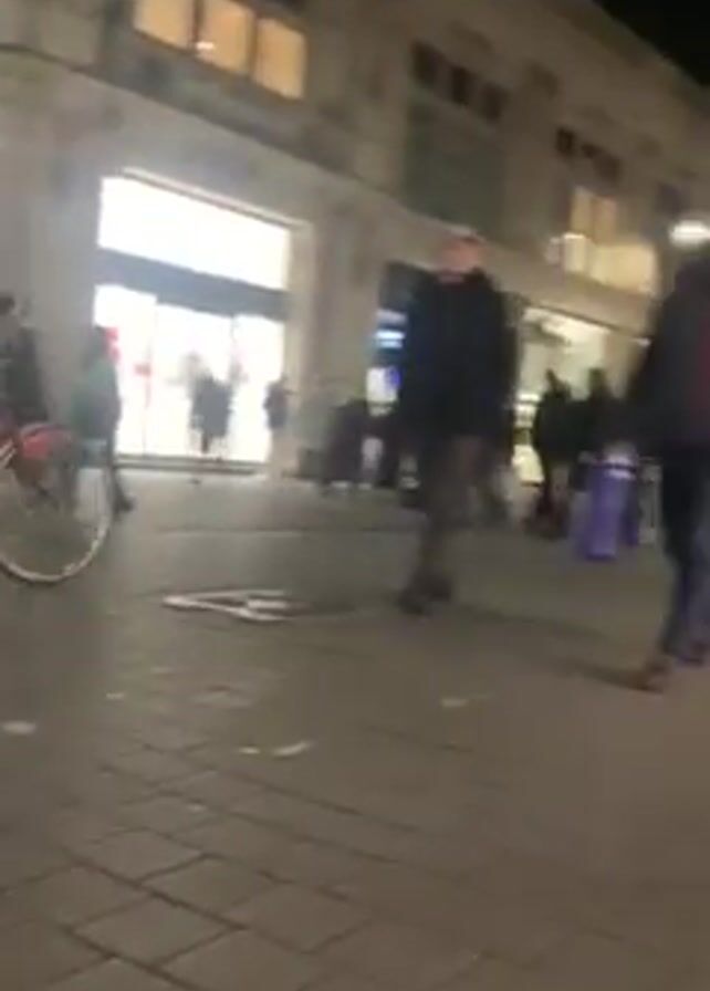 A person is filming a street scene at night. The street has sidewalks with pedestrians, and buildings with lit windows. The street itself is paved with light-colored stone blocks. At the start of the video, a person on a bicycle rides past the camera. A man wearing a jacket and scarf walks past on the sidewalk. A green illuminated pharmacy sign is visible further down the street. The camera moves and becomes unsteady, then captures more of the sidewalk and pedestrians.