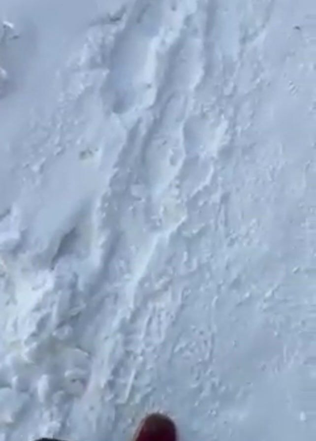 person walking in the snow on a winter day. The person is wearing dark pants and maroon boots. The ground is covered in snow and there are footprints. The camera pans up to show a stone post and then the sun, which is obscured by clouds.