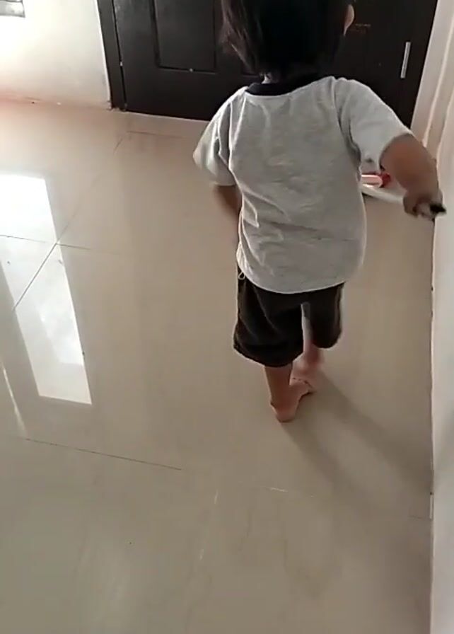 A young child with short black hair, wearing a gray t-shirt and dark shorts, stands barefoot on a light-colored tile floor and sweeps with a small broom that has a red and beige head and a wooden handle. The child sweeps the floor towards a dark brown door. The room has white walls and natural light is visible in the reflection on the tiled floor.