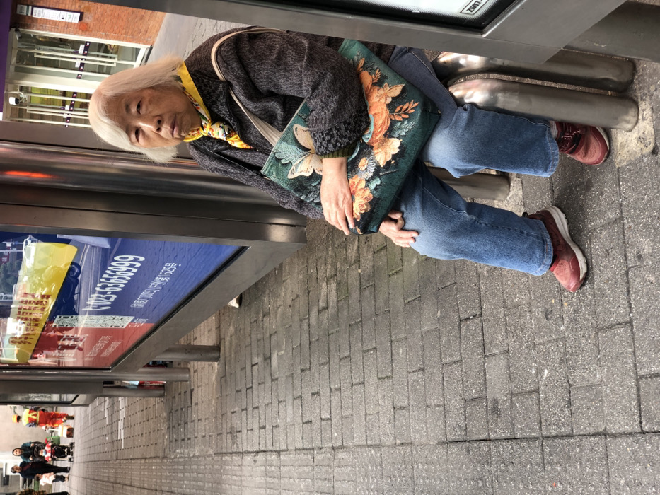 - "An elderly Asian woman with short, white hair sits at a bus stop" by FM-zXrdT2, licensed under CC BY 4.0
