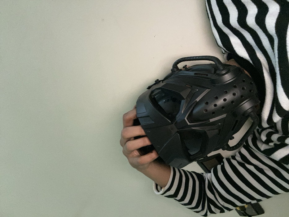 A person in a black and white striped shirt holds a black futuristic mask with holes and a handle. The mask is partially in front of the person's face. The background is a light gray wall. The person's hands are visible, holding the mask firmly. The shirt sleeves are long, and the stripes are vertical. The mask appears to be made of plastic.