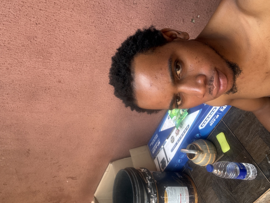 This image, captured in Oturkpo, Nigeria, depicts a close-up, shoulder-up portrait of an adult male. The subject possesses dark skin, short, black, curly hair, a light mustache, and a small goatee. He is shirtless and directly faces the camera with a neutral expression; several minor blemishes are visible on his forehead. The background consists of a textured, reddish-brown wall. To the lower left, a black bucket with labels is partially visible, alongside a beige cardboard box. On the grey tiled floor, a blue rectangular package, labeled "SP-6335," rests horizontally. Positioned in front of this package are a tan gourd-shaped cup containing a metal straw (consistent with a mate cup), a clear plastic water bottle, and a small, rectangular yellow sponge-like object. The scene is illuminated by ambient light, suggesting an outdoor or semi-outdoor setting.