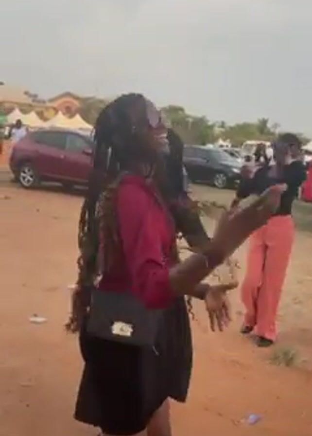 Three women are dancing in a large open space with a dirt ground. There are several cars parked, tents, and people in the background. The woman closest to the camera is wearing a burgundy top, a black skirt, and has long, braided hair. The woman to her right is wearing a black dress. The woman in the background is wearing a black top and pink pants. The women appear to be enjoying themselves.
