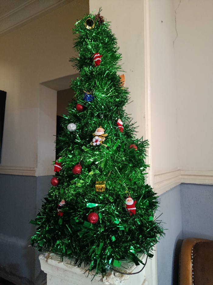 The image displays a decorated artificial Christmas tree situated in an indoor corner, likely a common area or hallway, in Unknown, Unknown