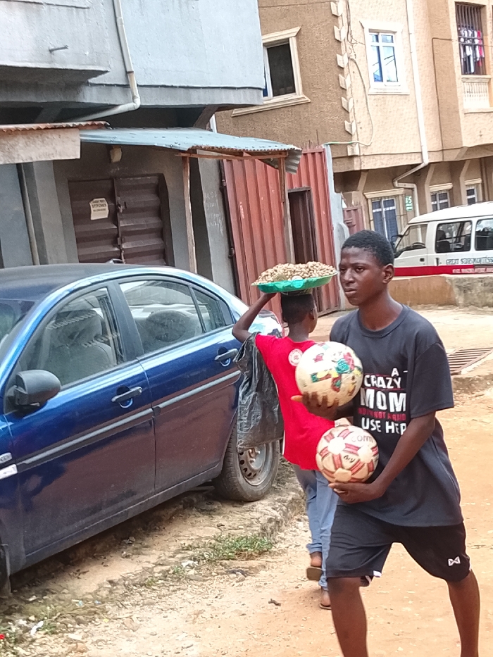 The image depicts an urban street scene in Awada, Nigeria. In the foreground, a dark-skinned young man, approximately late teens to early twenties, stands facing slightly left of the viewer. He wears a black t-shirt with white text reading "CRAZY MOM... NOT QUIET... USE HIPS" and black shorts. He holds two partially deflated soccer balls: one multi-colored with cartoon-like graphics at chest height, and another white and red/orange soccer ball below it, both held in his hands. Behind him and to the left, partially obscured by a dark blue four-door sedan, is a younger dark-skinned boy, estimated to be between 8 and 12 years old. He wears a red t-shirt and light blue jeans, with a black plastic bag slung over his left shoulder. He is balancing a round, shallow, light green tray filled with what appear to be groundnuts (peanuts) on his head, indicating street hawking. The blue sedan is parked on the left side of the unpaved, reddish-brown dirt road. The background features several buildings and structures. Immediately behind the boy and the car, a light grey/blue building with a corrugated metal awning covers a dark, shuttered entrance. A sign on this door reads "SURELY THIS... STITCHES". To the right of this, a reddish-brown corrugated metal structure, possibly a modified shipping container used as a shop or storage, stands. Further right and behind this, a tan/beige multi-story building with multiple windows is visible; laundry is hung on a balcony of an upper floor. A white minibus, possibly a commercial passenger vehicle, is parked behind the tan building and red container. The ground is unpaved dirt with scattered small patches of green vegetation. A metal grate, likely a drain cover, is visible on the far right.