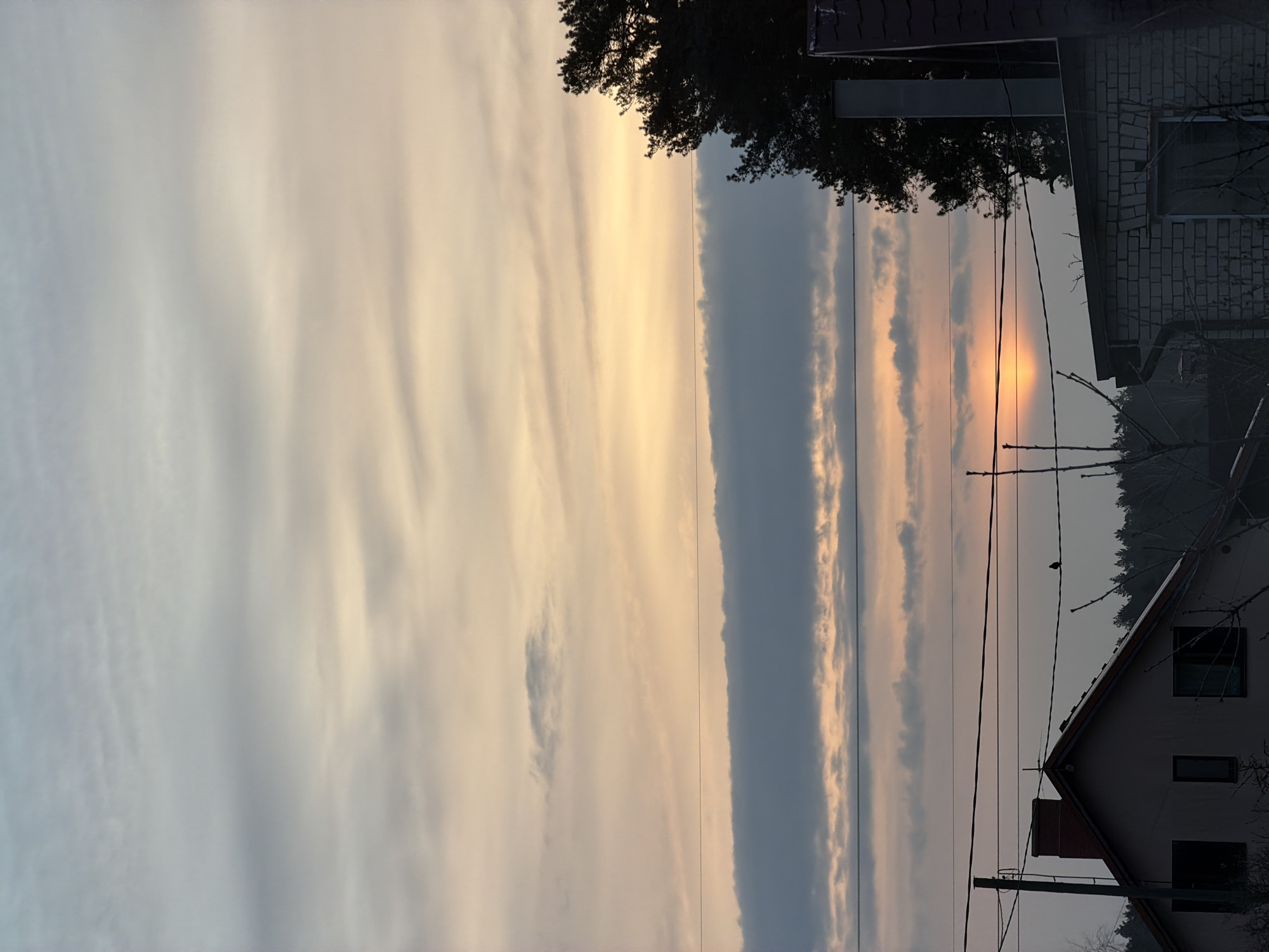 sunset view in Dreiliņi, Latvia. The sky is filled with elongated, horizontally oriented clouds. The right side of the sky exhibits an orange and pink hue, suggesting the setting sun's glow, while the left side is predominantly gray and white. The top of a house with a red roof can be seen, obscuring part of the lower right of the image. A brick building is visible at the top right, partially cut off by the frame. Several utility wires run across the bottom half of the frame. Silhouetted trees are visible above the brick building and behind the house. A bird sits on one of the utility wires.