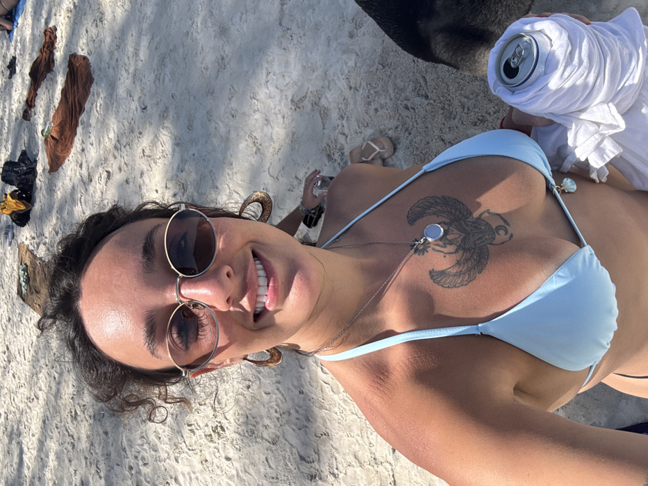 A tanned woman lies on a sandy beach, wearing a light blue bikini and round sunglasses. A striking tattoo of an eagle or similar bird is visible on her chest. She is smiling at the camera. A beer can wrapped in a white cloth sits beside her. In the background, there are clothes scattered on the sand and a pair of flip-flops. Her earrings are large and circular.