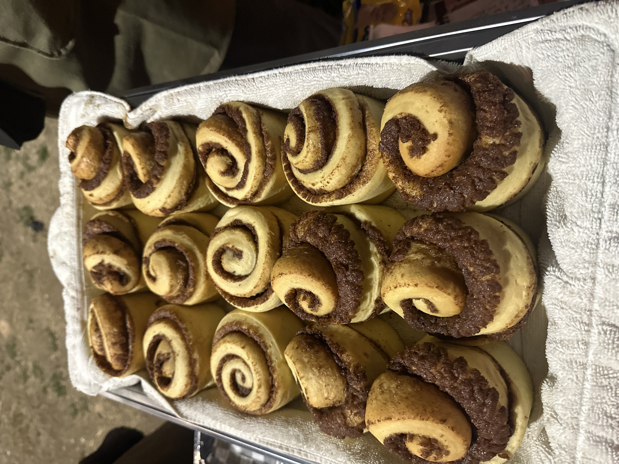 - "A baking sheet lined with a white towel contains 15 cinnamon rolls" by FM-Dtjpt1, licensed under CC BY 4.0