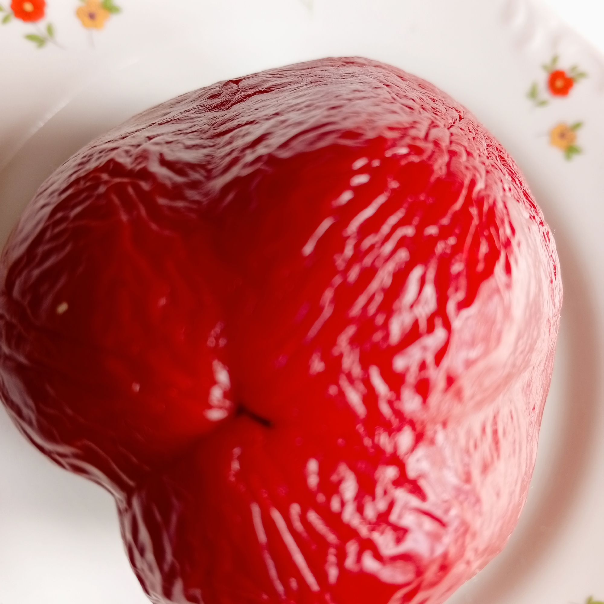 - "A single, large, deep red object, consistent with a roasted and peeled bell pepper, occupies the majority of the frame, resting on a white ceramic plate" by FM-tIMEp2, licensed under CC BY 4.0
