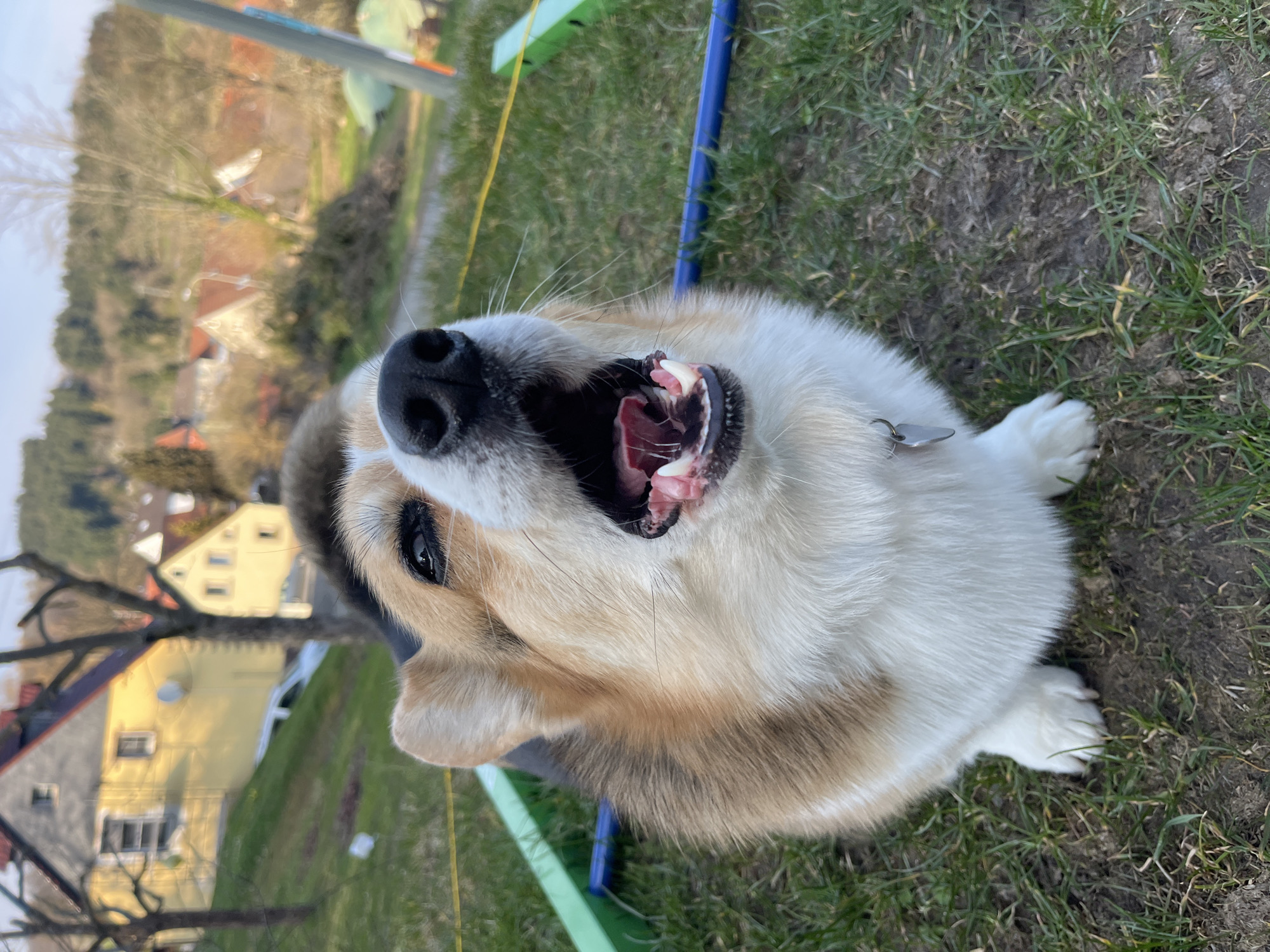 A tricolor Pembroke Welsh Corgi dog with white, brown/tan, and black fur is positioned on a patch of grass and dirt in the foreground. The dog's head is tilted upwards and backward, with its mouth wide open, exposing its teeth and tongue, indicative of barking or yawning. A silver identification tag is visible on its white chest fur near the front left paw. In the immediate environment, a green plastic frame component is present on the ground to the dog's left, and a blue cylindrical object lies horizontally to its right. A yellow cord or tape spans horizontally across the mid-ground. The background depicts a residential area of Gangloff, Germany, characterized by several houses with red-tiled roofs and varied facade colors, including a prominent yellow building equipped with a satellite dish, situated on a sloped, treed landscape under a clear, light blue sky.