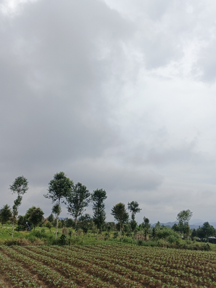 The image depicts an agricultural field and adjacent landscape in São Félix do Xingu, Brazil, under an overcast sky. A uniform light grey cloud cover occupies the upper two-thirds of the frame. In the foreground, numerous parallel rows of small, green cultivated plants are visible in dark brown soil, spanning the lower third of the image. The rows run diagonally from bottom-left to mid-right. The midground features a band of diverse green vegetation, including a line of approximately seven slender trees with visible trunks and green foliage, interspersed with smaller shrubs. A dark, possibly blue, object is partially obscured by vegetation in the left-midground. Faint, dark outlines of distant hills or mountains are visible on the far right horizon. No human or animal subjects are present, and no specific actions are depicted.