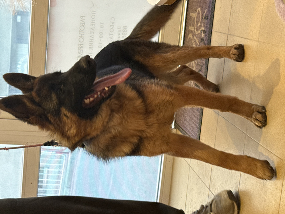 The scene depicts an indoor area within a building in Veliki Preslav, Bulgaria. A German Shepherd dog, exhibiting tan and black fur, erect ears, and an open mouth with an extended pink tongue, stands prominently in the center. The dog is equipped with a black collar and a red leash, which extends upwards and to the left. The flooring consists of light-colored tiles. To the left, the lower leg and a light-colored athletic shoe of a person are partially visible. Behind the dog, a large window or glass partition reveals a bright, indistinct outdoor environment. Inverted Cyrillic text, including "ПОНЕДЕЛНИК" (Monday) and "08:00-18:00," is visible on this glass surface, consistent with business hours. Two dark, patterned floor mats are situated on the tiled floor in the background, near a partially visible light-colored cylindrical object on the far right. The dog is positioned facing slightly right with its head turned to the right, appearing alert.