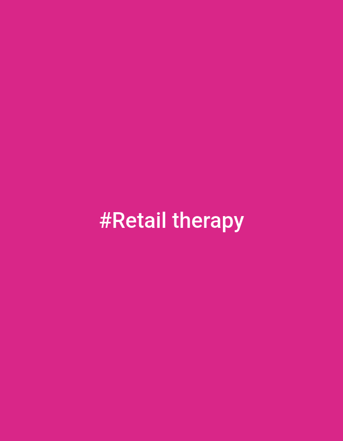 The scene, located in the city of Vlado Trichkov, Bulgaria, depicts a digital graphic. The entire background is a solid, uniform shade of fuchsia. Centered on this background is the white text '#Retail therapy'. No individuals, additional objects, specific environmental features, or actions are discernible within the image.