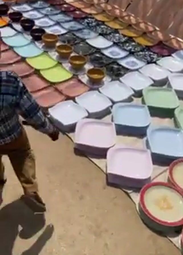 A sidewalk displays various dining ware items. Rectangular plates in pastel colors (white, pink, light blue, and light green) are neatly arranged. Smaller round bowls, some with matching saucers, are placed beside them. Further down the sidewalk are square-shaped dishes in brown and white. Finally, a row of metal spoons and spatulas of varying lengths are visible. A young child walks along the sidewalk, glancing at the items. The scene appears to be an outdoor market or a sale of household goods.
