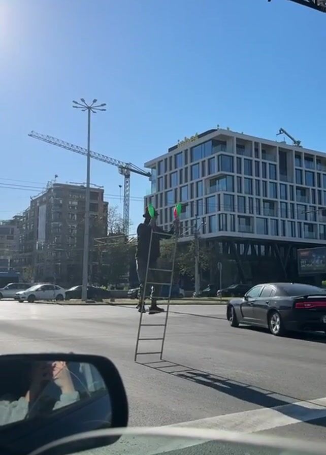The video, recorded from inside a car, shows a man standing on a ladder in the middle of a city street