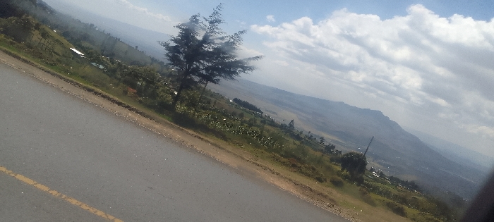 This image displays a tilted landscape view, presumably within Naivasha East ward, Kenya. The foreground consists of a section of paved asphalt road with a yellow dashed line marking its left edge, slanting diagonally from the lower left towards the upper right. A dirt shoulder borders the road, transitioning into a downward-sloping hillside densely covered in green and brown vegetation. A prominent, dark-foliaged tree stands on this slope, slightly to the right of the frame's center. Further into the midground, sparse small structures and cultivated patches are visible on the distant slopes, overlooking a wide valley. The background features hazy distant hills and mountains beneath a partly cloudy sky with white and grey cloud formations. No people, specific actions, or direct interactions are discernible within the frame.