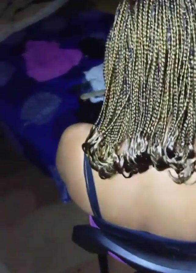 A person with blond braids, wearing a black bra and pink shorts, sits on a chair
