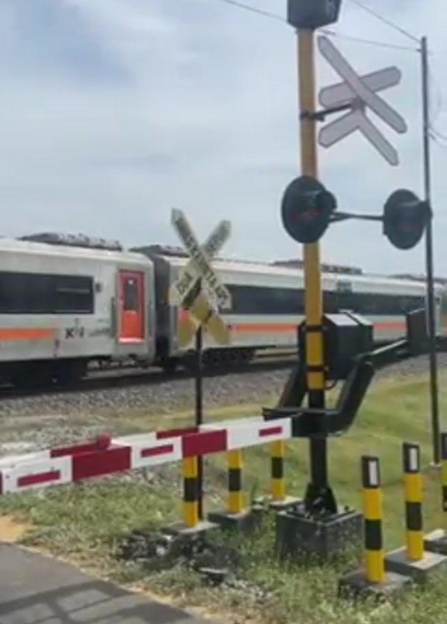 A train passes behind a railroad crossing. The crossing has a red and white horizontal barrier, and a pole with two flashing red lights and a sign that reads "Awas Kereta Api". The train is white with orange stripes. The sky is partly cloudy. The crossing is surrounded by green grass.