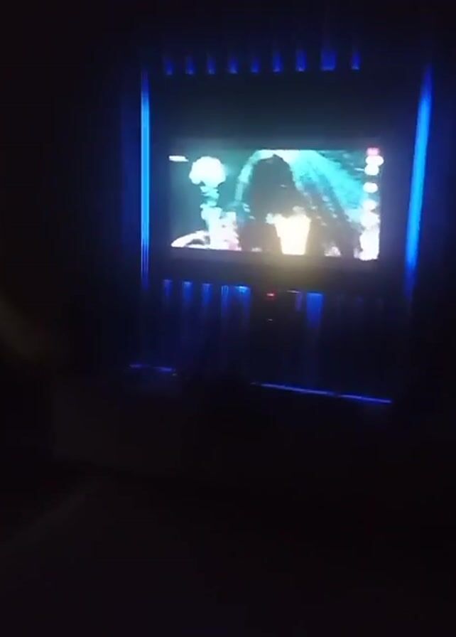 television screen framed by blue lighting in a darkened room. The image on the screen is unclear but appears to feature a person with long, dark hair and pale skin, possibly a character from a horror movie or similar genre. The scene is mostly dark, with the television screen providing the primary source of illumination. The room appears to be a living space, but specific details are obscured by the low light. The perspective suggests the video was taken from a low angle, looking up at the television.