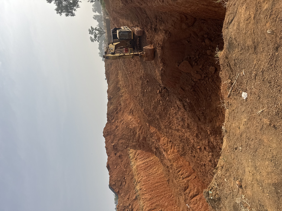 A narrow trench stretches into the distance, revealing layers of red soil. An excavator is positioned at the trench's far end, appearing small in comparison to the depth of the excavation. The ground shows distinct stratification patterns. Scattered trees are visible above the trench's edge, and the sky is overcast.