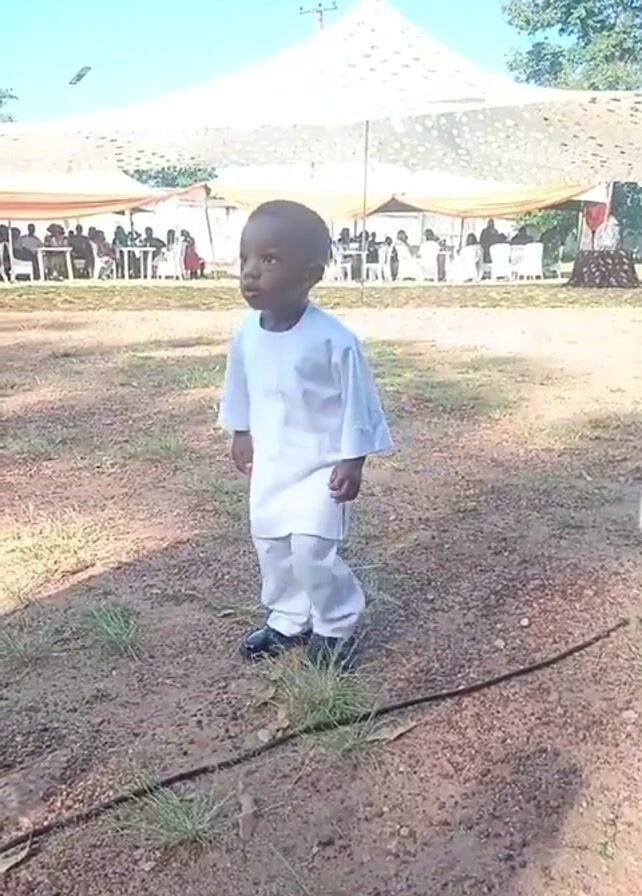 A young child dressed in a white, formal outfit and black shoes is standing on a dirt patch in front of a large, white tent. The tent is filled with people sitting at tables. The child is looking around and then starts to dance, pointing his fingers up in the air. The sky is blue and the weather appears sunny.