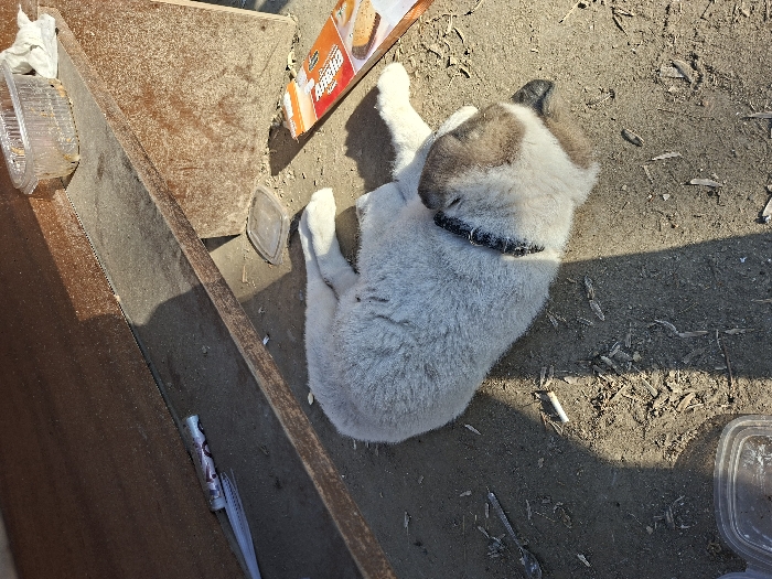 A light-colored animal, consistent with a young dog or lamb, is resting on its right side on a dirt ground surface in Moshtanets, Bulgaria. The animal displays mostly white fur with light brown markings on its head and ears, and is equipped with a dark-colored collar. Its eyes are closed, indicating a state of sleep or repose. The ground is composed of light brown-grey dirt, scattered with small wood chips, a discarded cigarette butt, and a small metal spoon. Adjacent to and above the animal are weathered, rough light brown wooden or particle board structures, possibly forming part of a makeshift shelter or raised platform. On the upper right wooden structure, a clear plastic food container containing white material is present. An orange and white cardboard box, appearing to be food packaging with partial text including "Anelia," lies on the ground near the animal's head. A clear plastic container lid is also observed on the ground near the animal's front limbs. A rolled object, consistent with paper, is visible underneath the left wooden structure. Shadows indicate direct sunlight in the scene.
