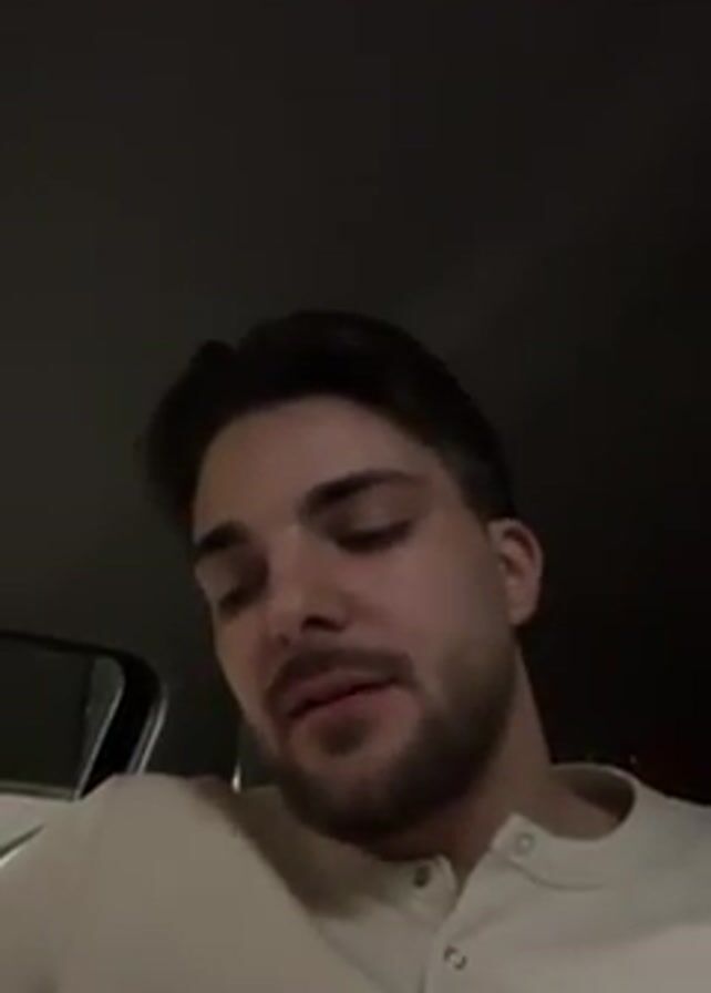 A person with dark hair and a light beard is looking downward and speaking. The person is wearing a light-colored button-up shirt and appears to be inside a car. The car interior is visible in the background.