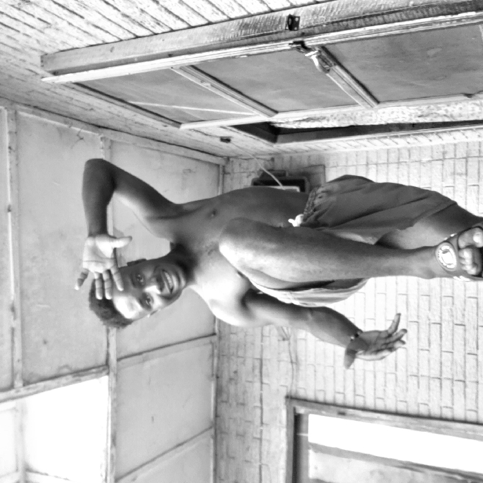 - "The monochromatic image depicts a young adult male in a dynamic pose within a residential or semi-outdoor setting in Narayi, Nigeria" by FM-iqXos2, licensed under CC BY 4.0