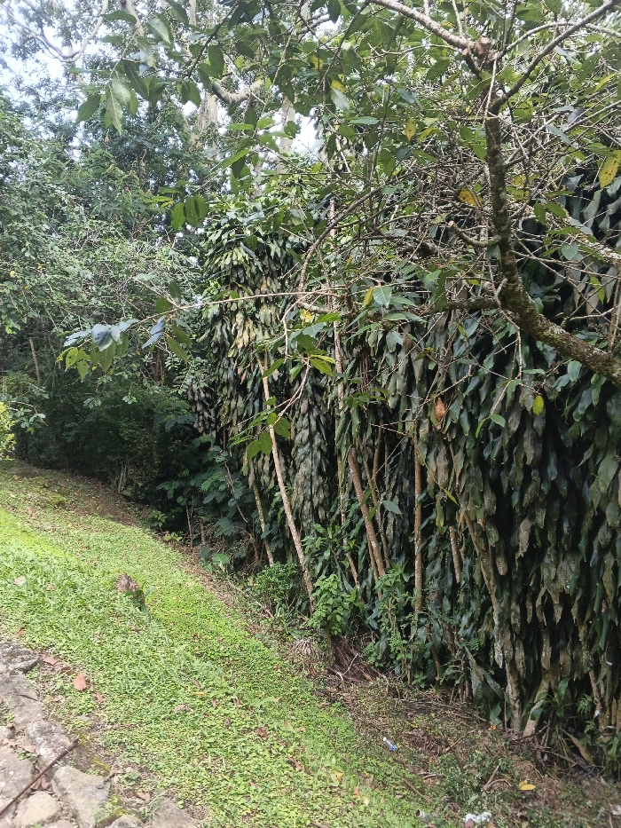 Lush greenery dominates the scene. A vibrant green lawn slopes downwards beside a dense thicket of vertical plants with long, teardrop-shaped leaves. Various green trees and shrubs fill the background, some partially obscured by the closer vegetation. A bare-branched tree is visible, its branches interspersed with green leaves and twigs. The landscape presents a natural, overgrown aesthetic.