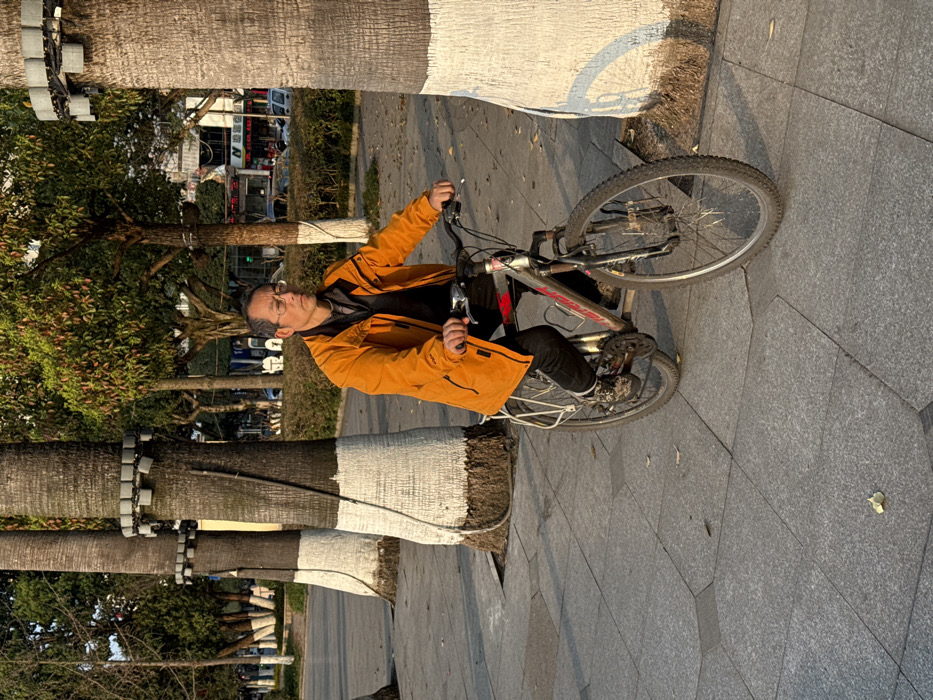 - "An outdoor scene in Jiangjin, China, depicts a lone East Asian male, appearing middle-aged, riding a silver-grey mountain bicycle from right to left across a paved pedestrian pathway" by FM-uU6wU2, licensed under CC BY 4.0