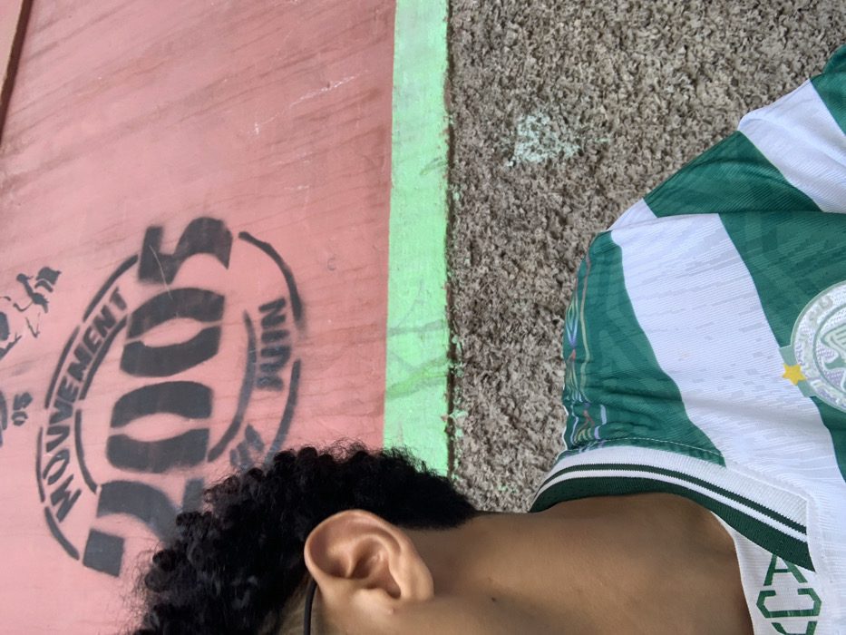 The image captures the left profile of an individual positioned against a segmented wall in Casablanca, Morocco. The person has short, curly dark hair, wears glasses with a visible black frame near the temple, and has a light brown complexion. They are wearing a green and white striped athletic jersey, consistent with a Raja Club Athletic uniform, identifiable by its color pattern and a partially visible club emblem featuring a star on the chest. The background wall consists of three distinct horizontal sections. The uppermost section is painted reddish-brown and features black stencil graffiti reading "MOUVEMENT 2005 JUIN" within a partial circular outline, indicative of the Ultras Eagles, a Raja Casablanca supporters group. Below this, a narrow, horizontal band of light green paint separates the reddish-brown section from the lower wall segment, which is characterized by a rough, grayish-brown textured finish with minor green paint splatters. The individual is static, with no discernible action.