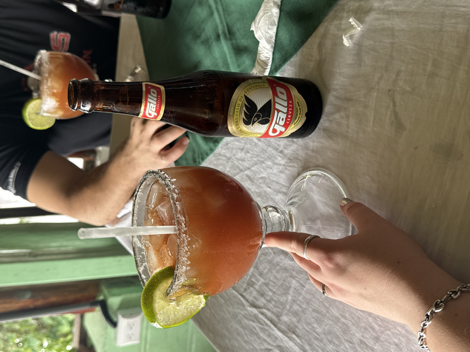A table setting featuring two Micheladas with salted rims and lime wedges, alongside a bottle of Gallo beer. A hand with rings rests on the stem of one glass, with a silver bracelet visible on the wrist. Another person's arm is partially visible. The table has a green accent and a light-colored tablecloth with some green fabric.