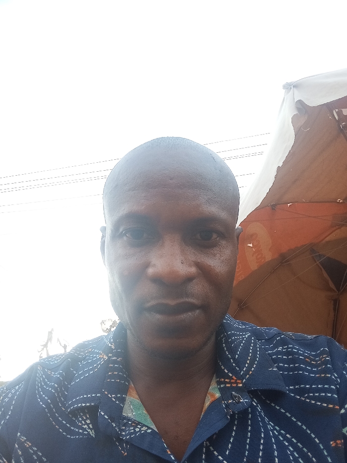 A close-up selfie captures a bald, dark-skinned man wearing a dark blue shirt with white and yellow pattern. His expression is neutral, and he appears to be outside in daylight. An umbrella, partly visible and slightly worn, is to his right. Overhead, telephone wires run across a bright sky.