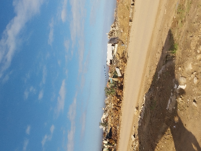 The image captures an outdoor scene in Az-Zahra, Palestinian Territory, under a clear blue sky with scattered white cumulus clouds. A wide, unpaved dirt road, light brown in color, occupies the lower half of the frame, extending diagonally from the lower right towards the mid-left. The immediate foreground consists of uneven dirt, small rocks, and sparse green vegetation, with a dark, elongated shadow cast across the lower left. Beyond the road, the midground and background present an extensive, chaotic landscape of debris and rubble. This includes large accumulations of brown woody material, fragmented concrete, masonry, and pieces of corrugated metal sheeting. A partially standing white structure, possibly a damaged building, is discernible amidst the wreckage towards the right background. The far horizon is hazy. No individuals, actions, or specific interactions are visible within the frame. The environment indicates a state of significant demolition, destruction, or waste accumulation.