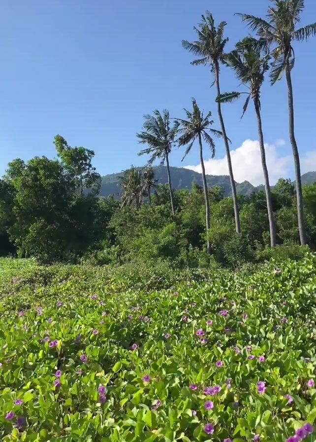 field of green plants with purple flowers against a backdrop of palm trees and a blue sky. The camera pans slightly to the right, revealing more of the field and palm trees. In the distance, there are mountains and a building with a red roof peeks out from behind the trees. The sky is mostly clear with a few scattered clouds.