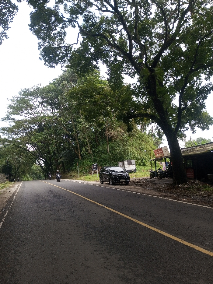 A black asphalt road with a yellow dividing line curves through a lush, green landscape. Trees densely line both sides of the road, creating a canopy overhead. A black car is parked on the right side of the road, next to a small roadside building. A few motorcycles are parked near the building. A motorcyclist is driving down the road in the opposite direction. A sign stands near the parked car, partially obscured by foliage. The sky is overcast.