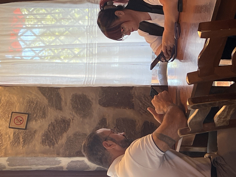 The image captures an indoor scene within an establishment in Civitavecchia, Italy, likely a restaurant or café. Two individuals are seated opposite each other at a glossy, reddish-brown wooden table. On the left, a male subject with short dark hair, a beard, and glasses, wearing a white polo shirt, is focused on a black smartphone held horizontally with both hands. A tattoo is visible on his right upper arm. On the right, a female subject with reddish-brown hair, styled with bangs and a ponytail, and wearing glasses, a white t-shirt, and a dark vest, is focused on a black smartphone held vertically with both hands. Her phone has a visible ring stand accessory on its back. No direct interaction between the two individuals is evident, as both are independently engaged with their devices. The environment includes a textured wall behind the male subject, appearing to be rough stone or a stone-like finish with irregular dark brown and lighter beige/grey patterns. A square "no smoking" sign, featuring a red circle with a diagonal line through a cigarette icon, is mounted on this wall. To the right, a window covered by sheer white curtains reveals green foliage and a red structure, possibly a tiled roof or awning, outside. Partially visible wooden chairs with a rustic design are positioned in the foreground at the table.