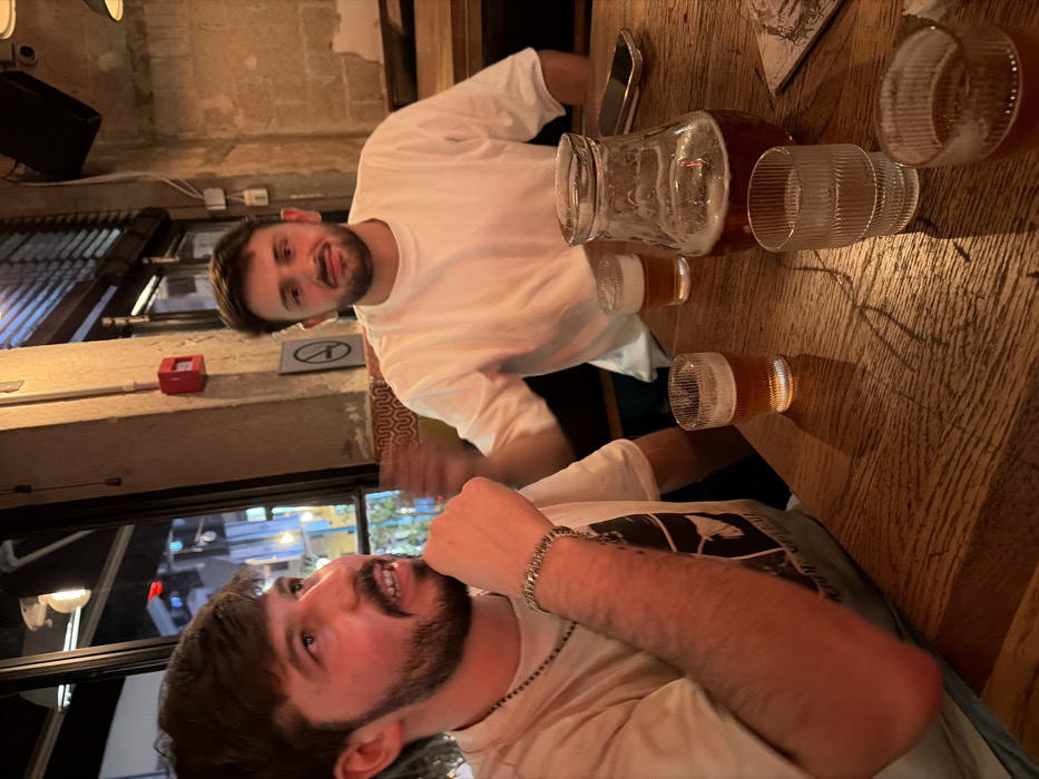Two adult males are seated at a wooden table inside a dimly lit establishment in Givatayim, Israel, likely a bar or pub, at night