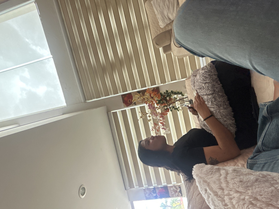 The image displays an indoor scene located in San Bernardino Tlaxcalancingo, Mexico. A female individual with dark, shoulder-length hair, wearing a black short-sleeved top, is seated on a light-colored couch or armchair, positioned in profile facing to the right. A tattoo is visible on her left upper arm, and a black bracelet is present on her right wrist. She holds a dark, pen-like object in her right hand, which rests on a textured grey cushion or blanket on her lap. Her gaze is directed towards the upper right. In the immediate foreground, the legs of a second individual, clad in blue jeans, are partially visible, suggesting another person is seated. The background includes a high ceiling featuring a large skylight that reveals a bright, cloudy sky. Below the skylight, two wall-mounted windows are covered with horizontally striped beige roller blinds, partially obscuring the exterior view. A floral arrangement consisting of orange, pink, and yellow artificial flowers in a clear vase is positioned on a surface between the seated female and the windows. Decorative panels with floral motifs are visible on the wall to the left. A recessed can light is integrated into the white ceiling on the upper left. A second light-colored couch or armchair with a white pillow is partially visible in the background to the far right.