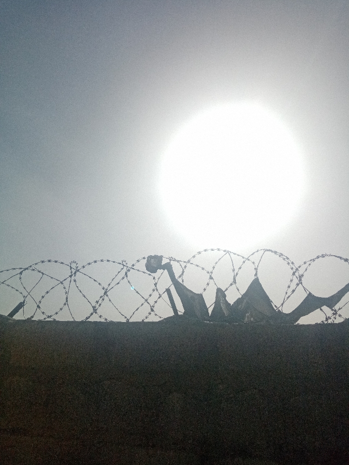 The scene, located in Dabawa, Nigeria, depicts a security barrier under intense, diffuse daylight. A dark, granular concrete wall occupies the lower third of the image, serving as a base. Strung horizontally along the top of this wall is a dense arrangement of coiled razor wire, forming interconnected diamond-shaped patterns across the entire width of the frame. Silhouetted against the bright background and entangled within or behind the razor wire are various dark, irregular objects. These include torn sections of fabric or plastic material draped over dark, jagged structural elements, possibly broken posts or debris. A small, unidentifiable dark object with a handle-like projection is visible near the left side, caught within the razor wire. The upper two-thirds of the image consist of a hazy, light-gray sky dominated by an intensely bright, diffuse circular light source, consistent with the sun, positioned in the upper right quadrant, which casts the foreground elements into strong silhouette. No human figures or active subjects are present.