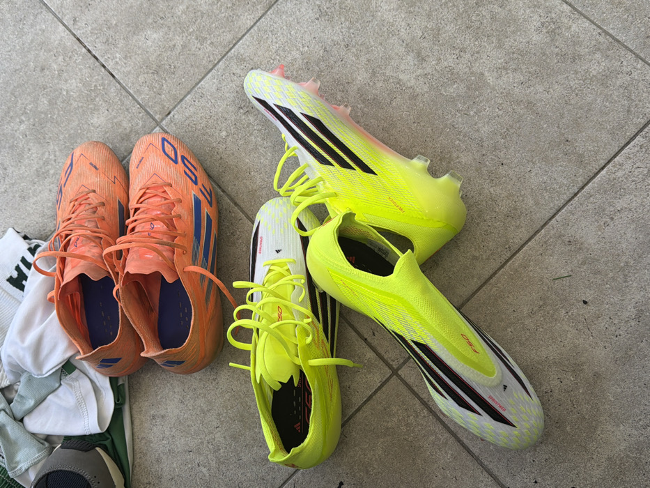 - "Two pairs of Adidas F50 soccer cleats rest on a tiled surface" by FM-sMVut2, licensed under CC BY 4.0