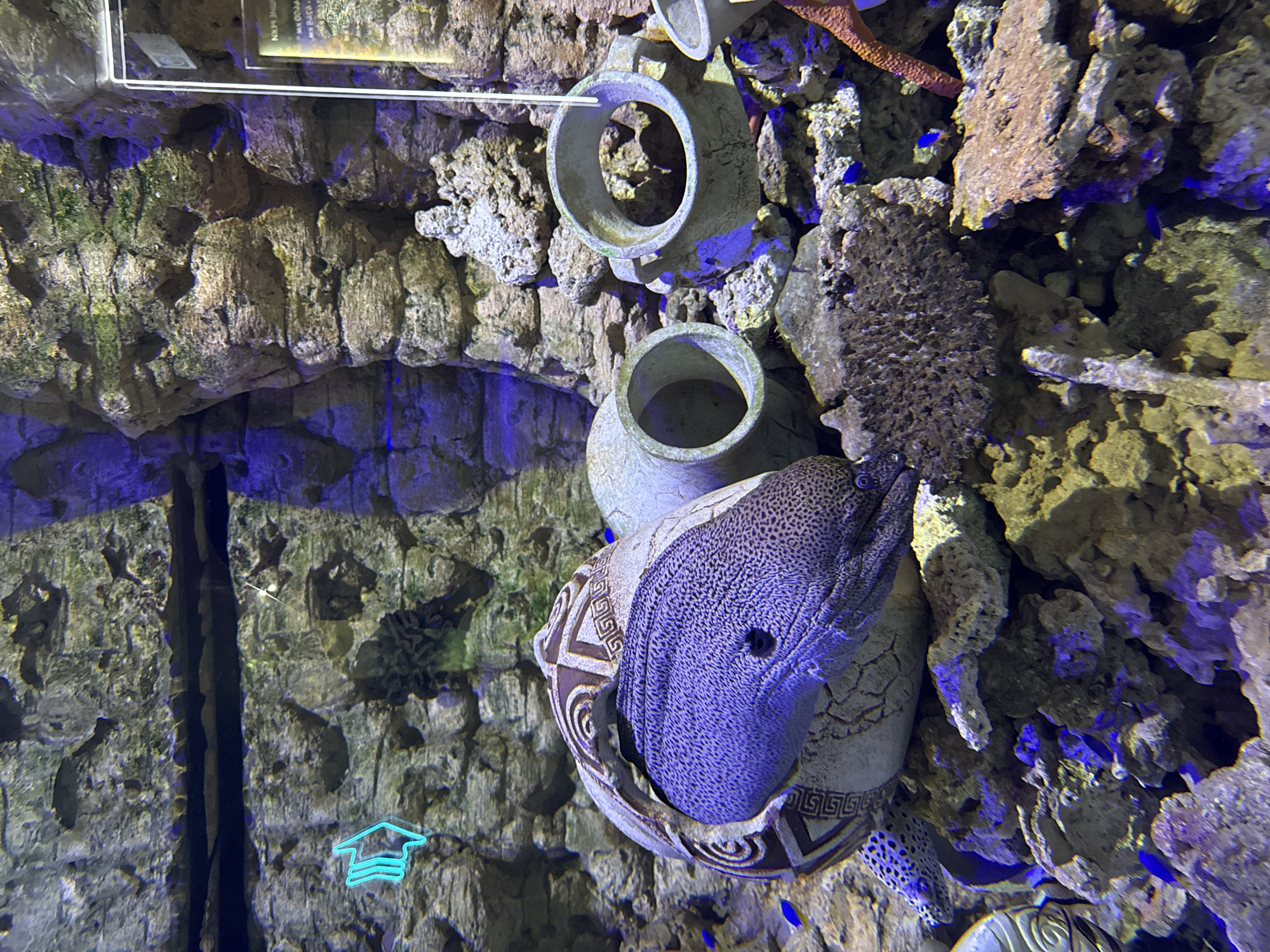 The image depicts a fish tank exhibit, likely at an aquarium or museum. Inside the tank, there are artificial rock formations and cracked ceramic pots, seemingly arranged to mimic a natural reef environment. A spotted moray eel is positioned within one of the pots, its head and upper body visible. The overall lighting is blue, creating an aquatic ambiance. There's some text on the top left, and a cyan-colored graduation cap on the bottom left. This image was taken in the city of Kogalym, Russia.