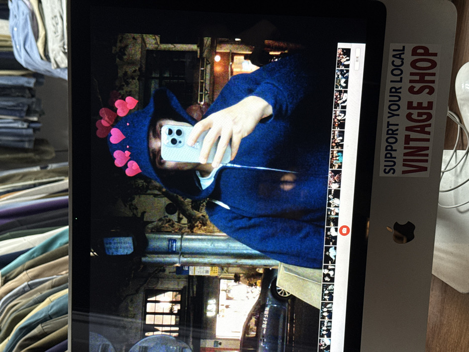 An Apple iMac computer screen displays a nighttime selfie captured on a street in Xuhui District, Shanghai, China. The main image on the screen depicts a male individual, partially obscured by the light-colored smartphone he holds in his right hand, reflecting his image. He wears a dark blue hooded sweatshirt with the hood up, and digital pink heart-shaped filters are superimposed around his head. The background of the selfie reveals an urban street scene at night. To the left, a dark sedan is parked in front of an illuminated building. A grey street pole prominently displays a blue sign with legible Chinese characters indicating "上海市" (Shanghai City) and "徐汇区" (Xuhui District), confirming the location. Other faint architectural features are visible under dim lighting. Below the selfie, a horizontal strip of thumbnail images, representing a photo gallery or editing interface, is visible along with a red circular button and Chinese text. The physical computer is a silver Apple iMac, identifiable by its logo on the lower bezel. A white rectangular sticker affixed to the lower right bezel reads "SUPPORT YOUR LOCAL VINTAGE SHOP" in blue and red text. The iMac rests on a light brown wooden surface. Above the computer screen, a clothing rack filled with garments of various colors (e.g., olive, beige, blue) is partially visible, suggesting an indoor retail setting.