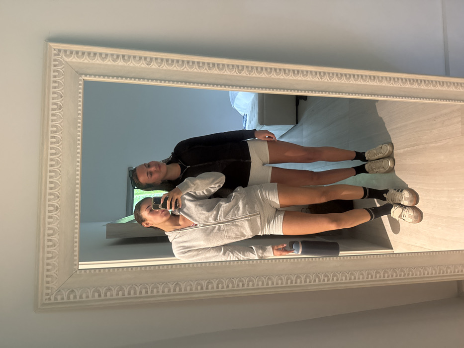 Two young females are captured in a full-length mirror selfie within an indoor setting, likely a residence. The mirror features a wide, ornate, light-colored frame. The female on the left, holding a dark-colored smartphone to take the photo and a dark blue water bottle in her other hand, wears a light grey zippered hoodie, light grey athletic shorts, black socks with white stripes, and light-colored sneakers. Her face is partially obscured by the phone, and her lips are slightly puckered. The female on the right, standing slightly behind and to the right, wears a black zippered hoodie, light grey athletic shorts, black socks, and light-colored sneakers. She has sunglasses perched on her head and looks towards the left. The reflected background shows light-colored walls, light wood or laminate flooring, and a glimpse of a light-colored bed or sofa. Green foliage is visible through a reflected window or doorway in the upper left background. The specific location within Palmetto Bay, United States, cannot be determined from the visual information.