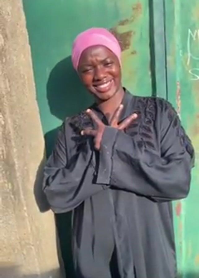 A woman stands smiling in front of a green metal door. She wears a long black robe with decorative embellishments on the sleeves and chest, and a pink head covering. Her arms are crossed over her chest, and she holds her hands in a gesture with her fingers pointed towards her shoulders. She is standing in sunlight, with her shadow cast to the left of the frame. A concrete wall borders the door on the left. Some graffiti is visible on the top right of the door.