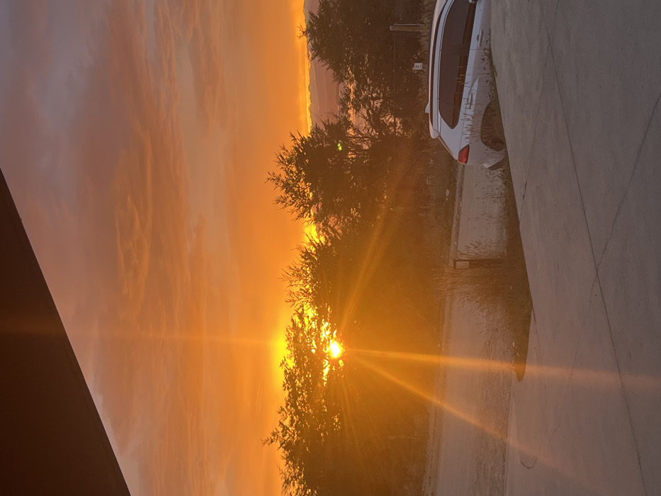 The image displays a sunrise or sunset over Ushuaia, Argentina. The sky is largely covered by clouds, illuminated in vibrant orange and yellow hues, with the sun low on the left horizon, partially obscured by a dense line of dark evergreen trees. Strong light rays emanate from the sun, extending downwards and rightward across the lower left quadrant. The immediate foreground features a concrete surface, possibly a driveway or pavement. Adjacent to this, a patch of dry, tall grasses and a dark, slender post are visible. A light-colored crossover SUV, appearing dirty or dusty on its lower body, is parked on an unpaved road or shoulder on the right side of the image, partially obscured by vegetation and the terrain's incline. Beyond the tree line, a body of water, identifiable as the Beagle Channel, stretches towards the right, with a distant mountain range visible on the far horizon under the diffused light. No people are present.